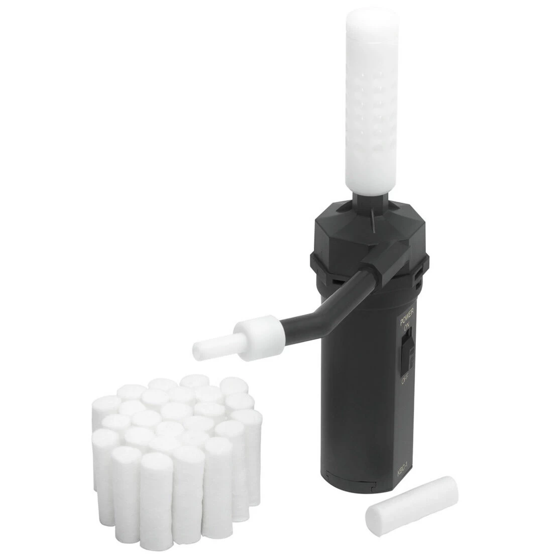 Doordrenk het filter met een aroma naar keuze en plaats deze in de witte huls op de aromaverstuiver. Is de verstuiver ingeschakeld, dan wordt er lucht door het gearomatiseerde filter aangezogen en uitgeblazen door het pijpje aan de zijkant. De aromafilters zijn bedoeld voor eenmalig gebruik en apart leverbaar.