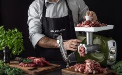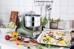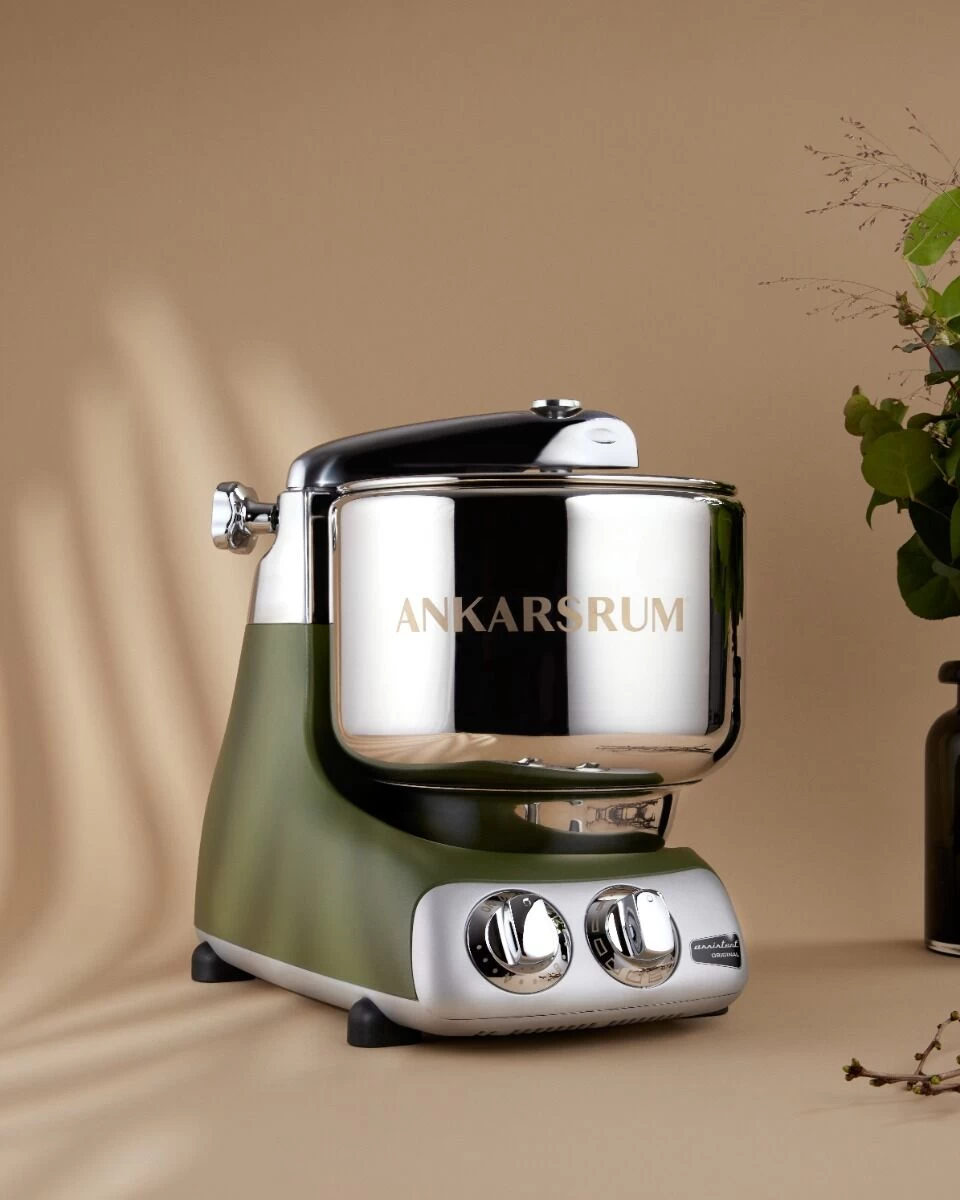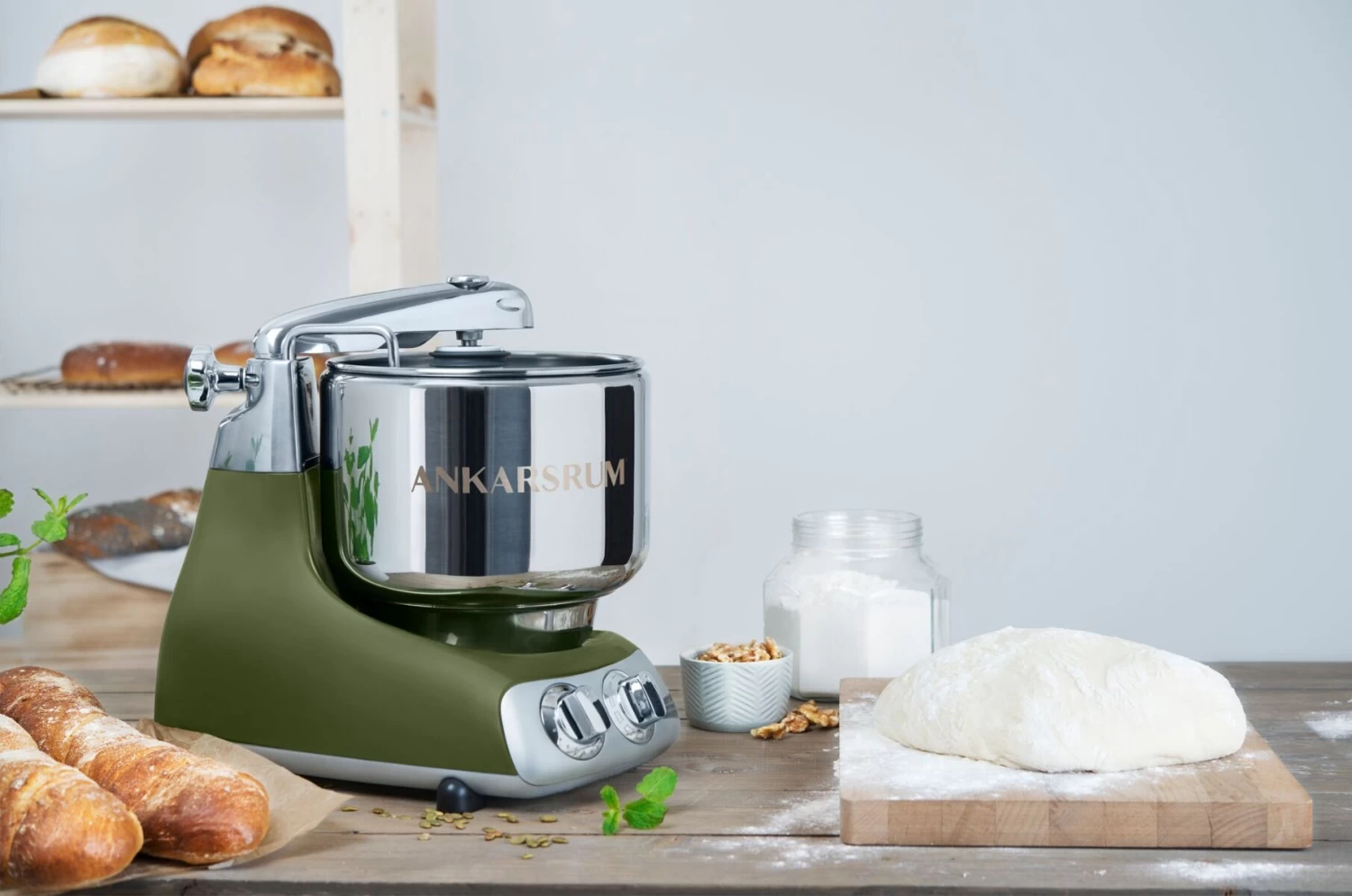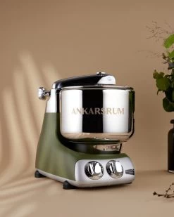 De Olive Green, olijfgroene, Ankarsrum Assistent Original kneedmachine is vervaardigd uit gegoten aluminium en heeft een roestvrijstalen mengkom met een inhoud van 7 liter. De vernieuwde versie 6230 is uitgerust met een extra krachtige 1500 Watt sterke motor. De machine heeft een capaciteit voor het kneden van 5 kg deeg of 1,5 liter vloeistof. Tevens is de machine met accessoires om te bouwen tot een veelzijdige keukenmachine. De keukenmachine is: 40 x 27 x 36 cm (l x b x h).