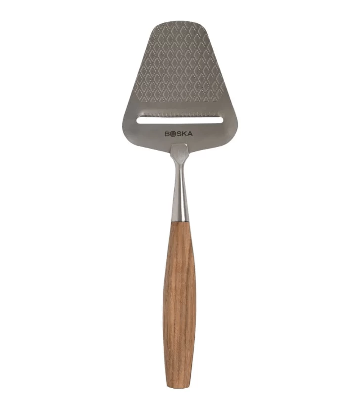 De Boska Oslo+ kaasschaaf is vervaardigd uit roestvrij staal en hout. Het blad van de schaaf is voorzien van een anti-kleefcoating en een ruitpatroon. Hierdoor blijft ook halfharde kaas niet aan het blad kleven.Â