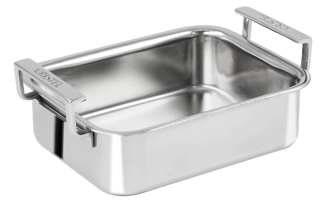 De Cristel mini braadslede is gemaakt van roestvrij staal met een aluminium tussenlaag voor een goede warmtegeleiding. De braadslede heeft een buitenmaat van 15,5 cm lang en 11 cm breed en is inclusief de handgrepen 5,5 cm hoog. De binnenmaat is 12 x 10 cm.