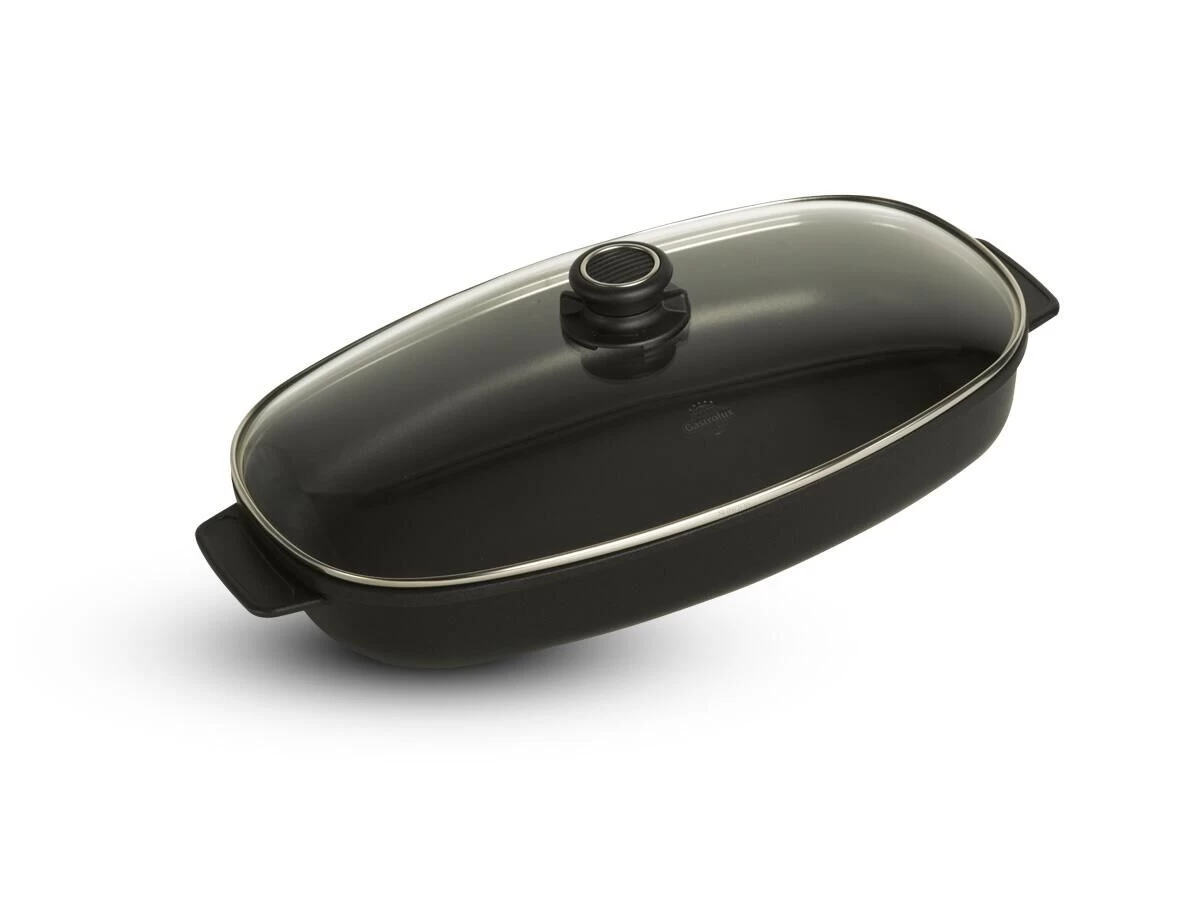 De pan heeft exclusief grepen een afmeting van 40,5 x 24,5 x 14 cm (hoogte exclusief deksel: 7 cm) en een inhoud van 4 liter. De binnenzijde is voorzien van een unieke Biotan anti-aanbaklaag. Deze verlengt de levensduur van uw pan, voorkomt aanbakken en verzekert u keer op keer van een gemakkelijke reiniging. De pan en de handvatten zijn uit hetzelfde stuk materiaal gegoten. Hierdoor is deze bevestigd zonder schroeven of losse onderdelen, wat een zeer veilige en comfortabele handligging als resultaat heeft. Gebruik de Gastrolux Expert braadpan voor het braden van grote stukken vlees op gezonde wijze: dankzij de Biotan-laag gebruikt u tijdens de bereiding aanzienlijk minder olie of vet.