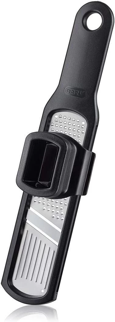 De Gefu Rafino knoflooksnijder beschikt over een vingerbeschermer om de knoflook mee te kunnen bewegen over de rasp en een stevige anti-slip greep.