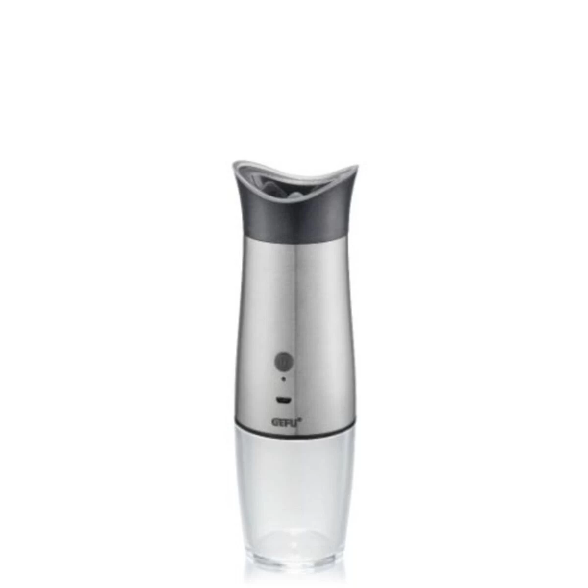 Gebruik de Gefu zout- of pepermolen voor het malen van zout of peper> De molen is gemakkelijk te bedienen en bij te vullen en is oplaadbaar via een USB-kabel. Reinig de zout- of pepermolen eventueel met een licht vochtige doek, zorg dat er geen water in het maalwerk komt.
