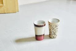Het HK Living 70’s peper- en zoutstel is gemaakt van geglazuurd aardewerk in de kleuren Peat (blauw, groen en bruin) en Asteroids (crème en oranje). Beide potjes hebben een diameter van 4,8 cm en een hoogte van 9,8 cm.