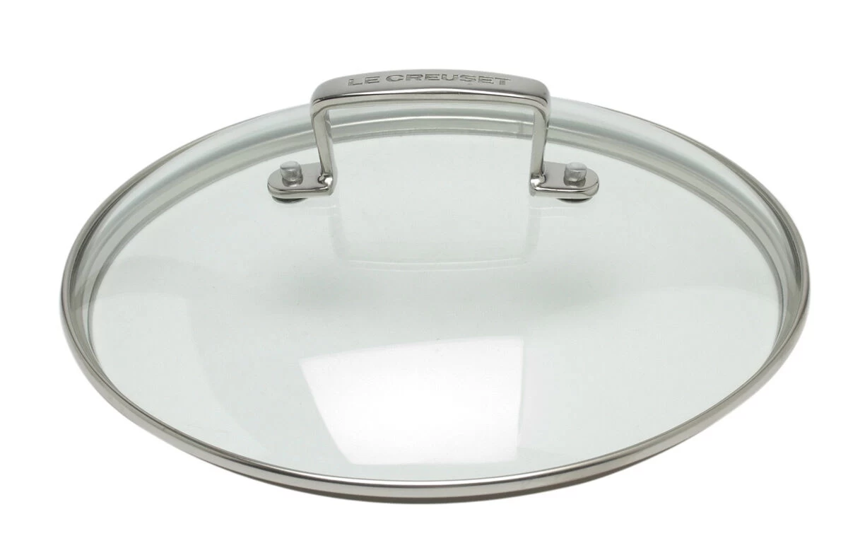 Het glazen deksel van Le Creuset is zeer resistent door het geharde glas en de smalle roestvrijstalen rand.