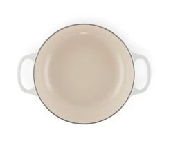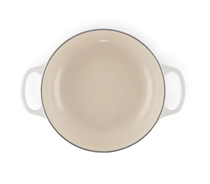 De Signature sauteuse van Le Creuset in de kleur Meringue heeft een diameter van 24 cm. De ronde pan van geëmailleerd gietijzer heeft een inhoud van 3,4 liter. De sauteuse heeft extra grote grepen. De ronde vorm maakt de Signature sauteuse geschikt voor soep en stoofgerechten als boeuf bourguignon.