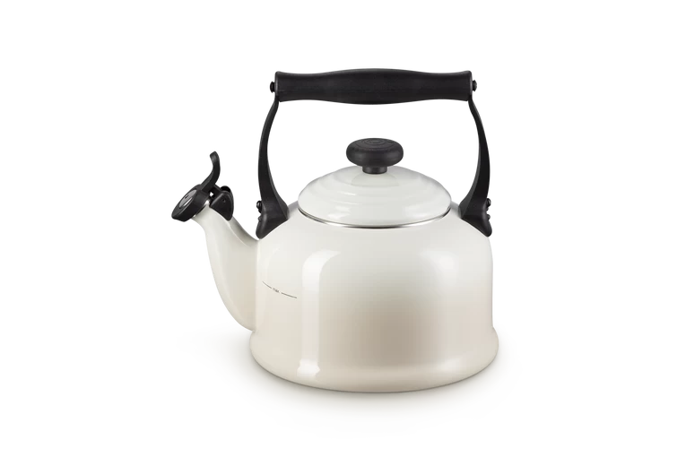De Tradition fluitketel van Le Creuset heeft een inhoud van 2,1 liter en is gemaakt van geëmailleerd plaatstaal in de kleur meringue. Gebruik de fluitketel voor koken van water op alle warmtebronnen, inclusief inductie of op de potkachel.