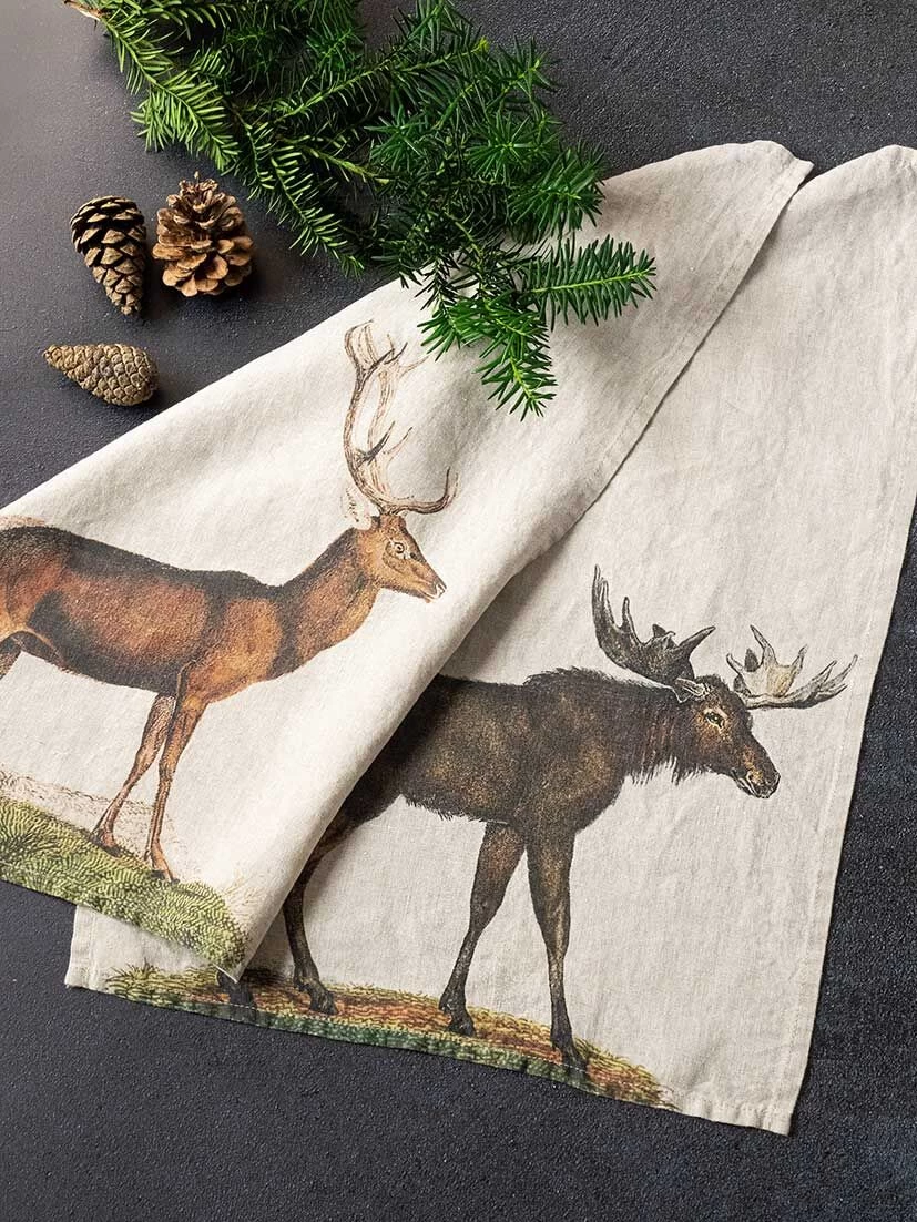 De Oldenhof Deer & Moose handdoek is gemaakt van eco-vriendelijk linnen en is uitgevoerd in de kleur beige met op de ene handdoek een eland en op de andere handdoek een hert. De handdoek heeft een lengte van 60 cm en is 42 cm breed. Gebruik de doek voor het afdrogen van uw handen na het wassen en als mooie accessoire in uw keuken of badkamer. De linnen handdoeken zijn ook perfect voor bijvoorbeeld het drogen van uw wijnglazen. De set bestaat uit twee stuks.