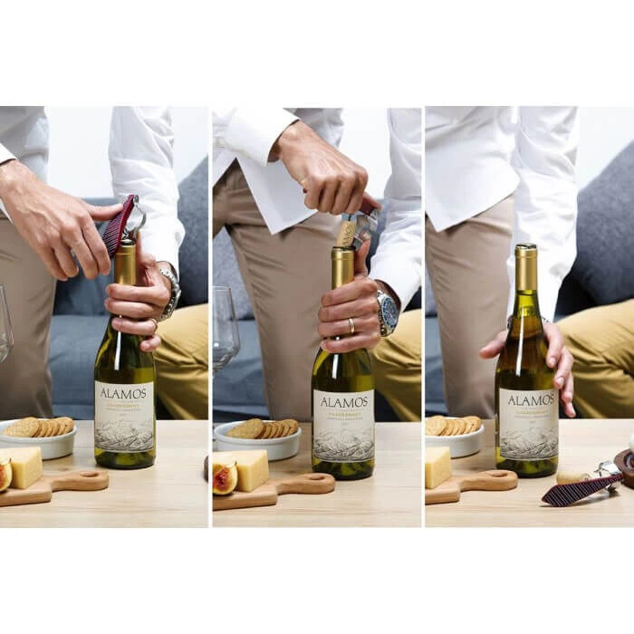 Met de rode Peleg Bottle Tie kurkentrekker opent u zeer gemakkelijk een fles wijn of drank. De opener is vormgegeven als vrolijke stropdas met print en past om de hals van een fles.