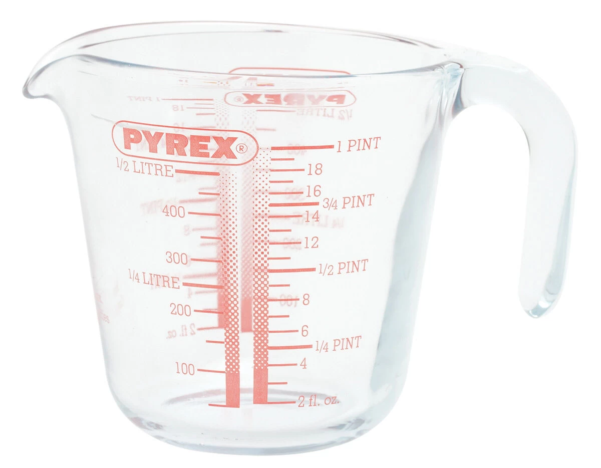 De Pyrex Classic maatbeker is gemaakt van borosilicaatglas en heeft een inhoud van 500 ml. Deze inhoud wordt weergegeven in ml, oz. en pints. Gebruik de maatbeker voor het afmeten van bijvoorbeeld suiker, bloem en water.
