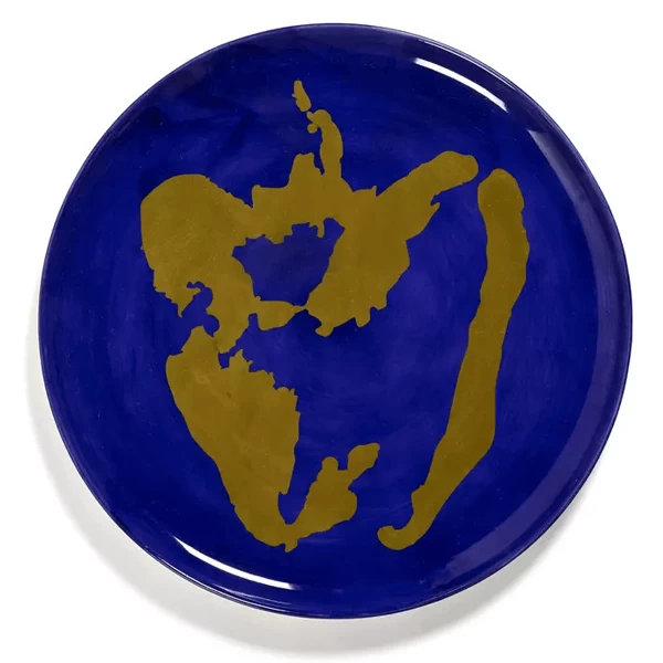 Het Serax Feast by Ottolenghi serveerbord heeft een diameter van 35 cm en is 2 cm hoog. Het aardewerken bord is blauw van kleur en heeft een gouden schildering.