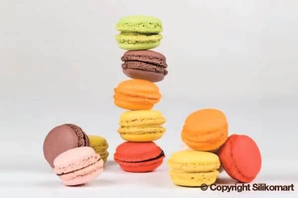 De Silikomart bakmat voor macarons is vervaardigd uit bruin silicone. De macarons hebben een diameter van 3,5 cm. Op de macaronmat bevinden zich 48 vormen voor het maken van 24 macarons.