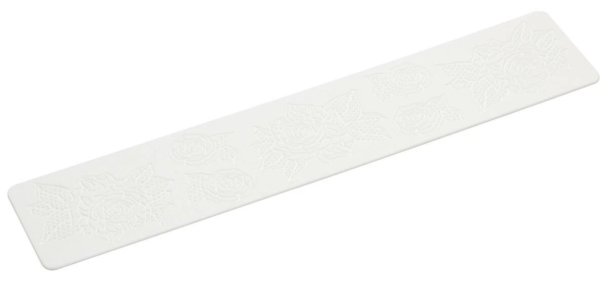 De Silikomart Tricot Roses siliconen decoratiemat is 40 cm lang en 8 cm breed. Voorzie uw taarten, cupcakes of koekjes van decoratieve en smakelijke suikerlagen.
