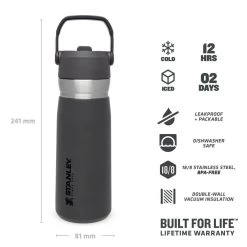 De mat zwarte Stanley The Legendary Classic thermosfles is gemaakt van roestvrij staal en heeft een een inhoud van 2,3 liter. De coating heeft een hamerslageffect. Voor extra draaggemak is de thermosfles voorzien van een handvat. De kunststof delen zijn BPA-vrij. In de Stanley Classic thermosfles blijven dranken tot 24 uur lang warm of koud, door ijsblokjes toe te voegen verlengt u de koelduur tot 120 uur.