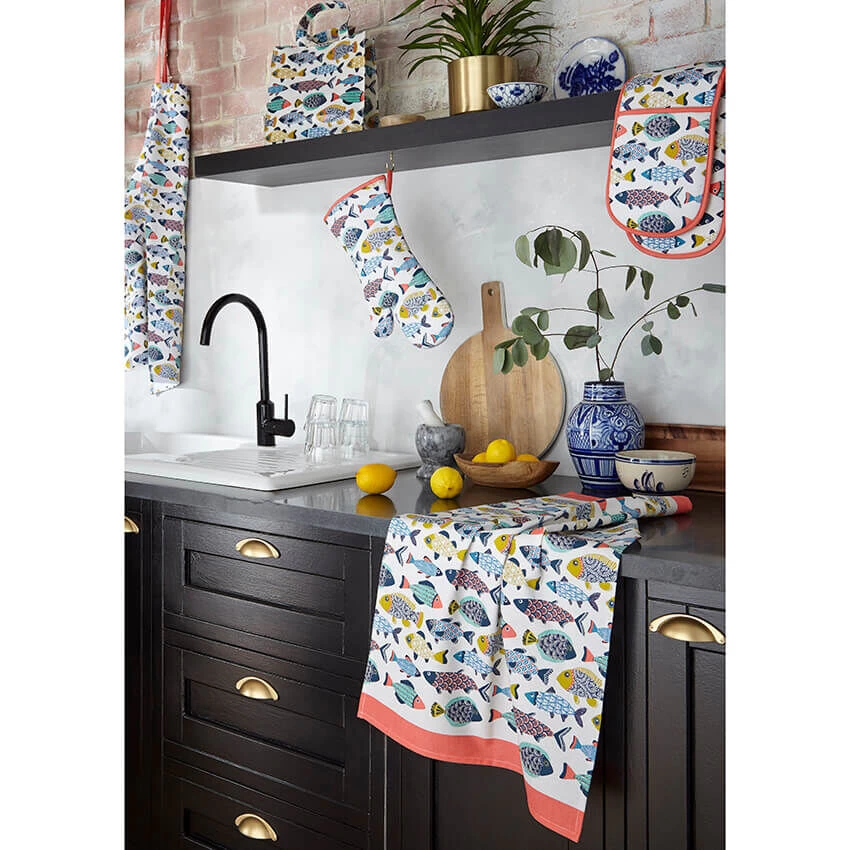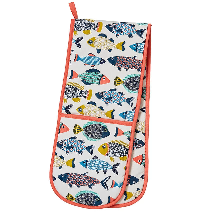 De oranje Aquarium lange pannenlap van Ulster Weavers is vervaardigd van katoen en voorzien van een polyester vulling voor isolatie en bescherming. De pannenlap is vormgegeven met een vrolijke vissenprint, een handig ophangoog en twee brede steekvakken. Gebruik de pannenlap om hete pannen van het fornuis of uit de oven te pakken. De pannenlap is 88 cm lang en 18 cm breed.
