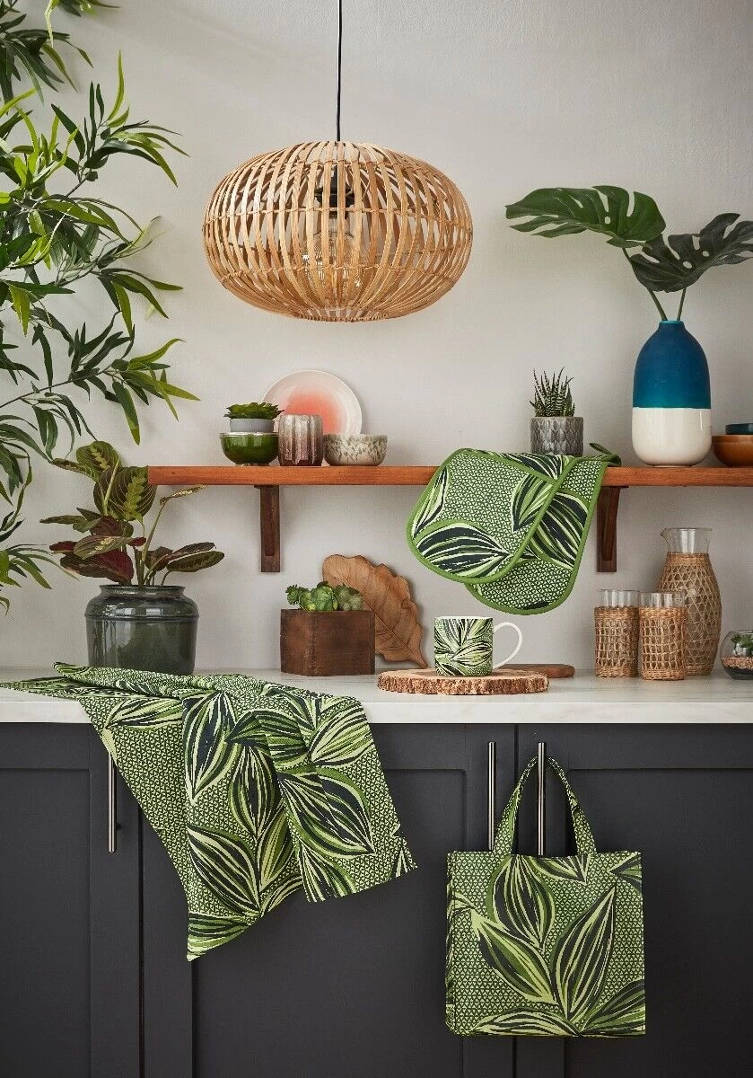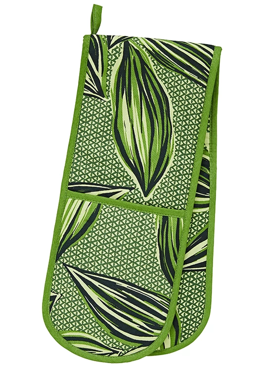 De Geo Leaves lange pannenlap van Ulster Weavers is vervaardigd van katoen en voorzien van een polyester vulling voor isolatie. Gebruik de pannenlap op hete pannen van het fornuis of uit de oven te pakken. De pannenlap is voorzien van een afbeeldingen van bladeren op een groene ondergrond. De pannenlap is 88 cm lang en 18 cm breed.